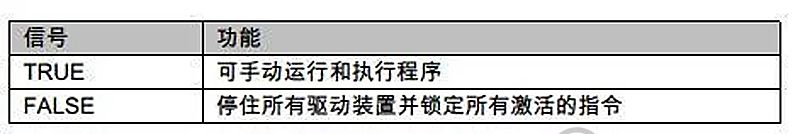 如果在此輸入端上施加了持續(xù)至少20毫秒的高脈沖,則上級(jí)控制系統(tǒng)會(huì)接通機(jī)器人驅(qū)動(dòng)裝置。