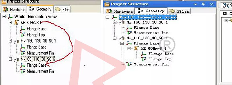 旋轉軸配置和上面步驟相同,除了這步:添加完后把KR60HA_3拖到MX_60_110_30_S0的FLANGEBASE下面,如圖8,這步配置旋轉軸時不需要執行:文件/名錄管理,把所有的文件移至右邊。出現“安全配置的校驗總和不正確”故障,執行“配置/安全配置”。